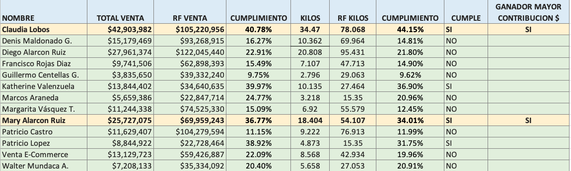 Estimado cuerpo de ventas, este es el resultado general del Concurso Campaña de Incentivos, que corresponde a la semana del 05 al 09 de agosto, para el cumplimiento del 25% de la meta en kilos y pesos.
