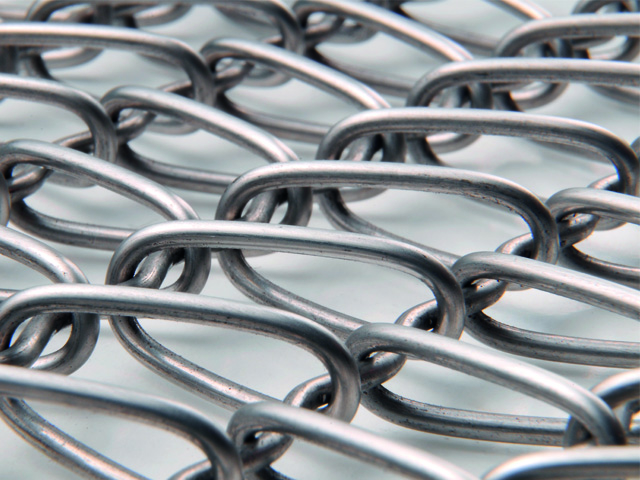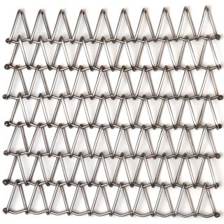 Tejido flexible, resultado de combinación de espiras y pasadores de alambre fabricado en acero inoxidable AISI 316 de diámetro 2 mm. La distancia entre pasadores es de 20 mm y la medida entre el paso de la espira es de 15 mm con terminación de orillas soldadas.