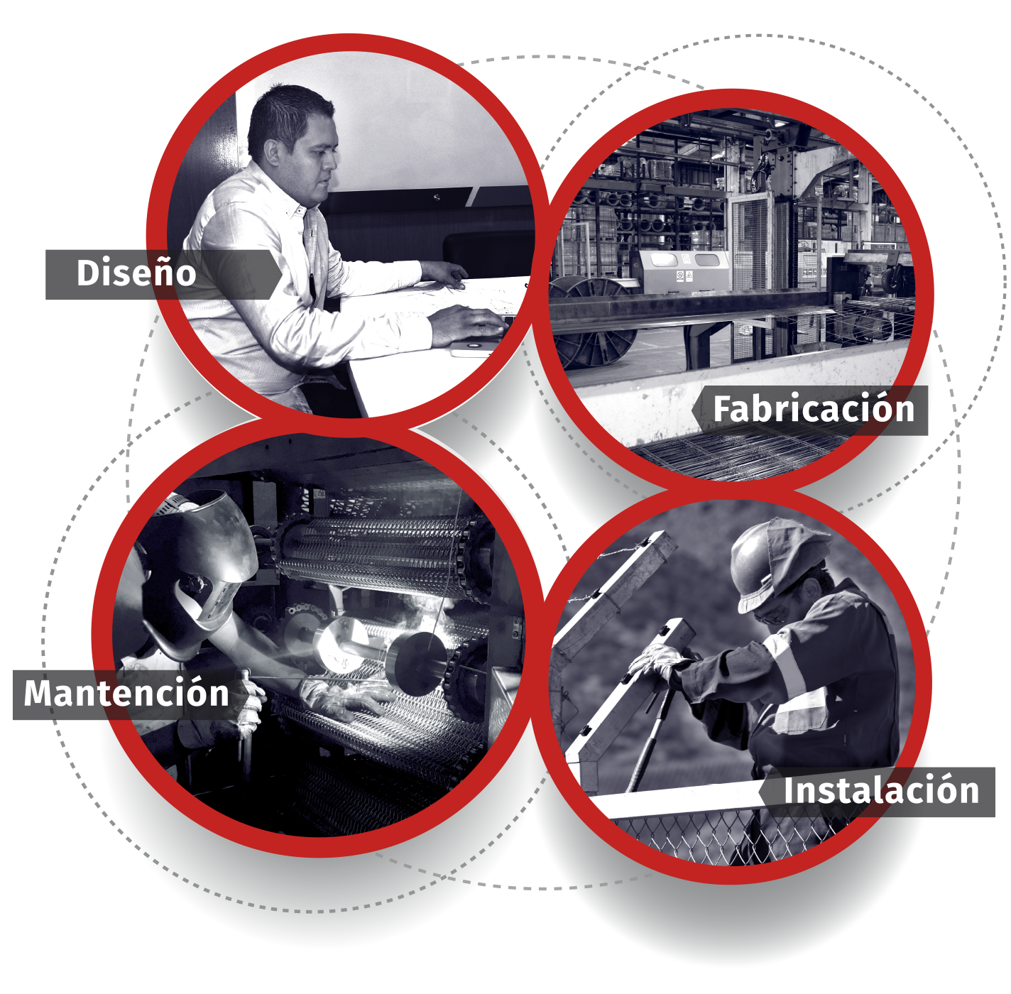 Para clientes finales, nuestro concepto integral nos permite ofrecer soluciones que consideran el diseño, fabricación, instalación y mantención de cercos perimetrales, de cintas transportadoras, de elementos de seguridad perimetral, etc., resolviendo así la totalidad de sus requerimientos.